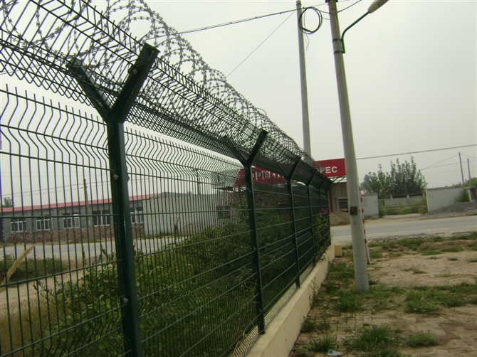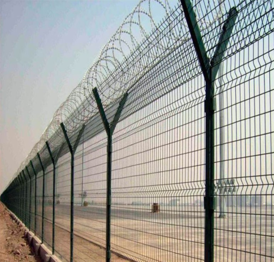 機(jī)場(chǎng)圍界網(wǎng)又稱作機(jī)場(chǎng)隔離柵“Y型安全防御護(hù)網(wǎng)”,是由V型支架立柱,加強(qiáng)型焊接片網(wǎng),安全防盜連接件和熱鍍鋅刀片刺網(wǎng)組成強(qiáng)度和安全防御性級(jí)別很高。近年來(lái),被廣泛應(yīng)用在機(jī)場(chǎng),軍事基地等高安全場(chǎng)所。