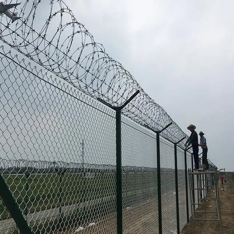 鋁包鋼絲機(jī)場(chǎng)圍界網(wǎng)是使用一種新型原材料鋁包鋼絲制作而成的機(jī)場(chǎng)圍界網(wǎng)產(chǎn)品,鋁包鋼絲是將鋼絲芯線外層包裹一層鋁作為外層防腐材料,它比傳統(tǒng)的PE或者PVC包塑鋼絲防腐性能更強(qiáng),通??梢匝娱L(zhǎng)機(jī)場(chǎng)圍界產(chǎn)品使用壽命10-15年以上,適合于沿??諝鉂駶?rùn)腐蝕性強(qiáng)的地區(qū)和環(huán)境較惡劣的沙漠邊緣地帶。鋁包鋼絲機(jī)場(chǎng)圍界網(wǎng)孔一般為50*50mm,絲徑5mm,頂部可搭配有V字叉和刀刺滾籠以加強(qiáng)防護(hù)能力。它還有一個(gè)優(yōu)點(diǎn)就是鋁層是與鋼絲一起經(jīng)機(jī)械拉拔到一起的,不易脫落。