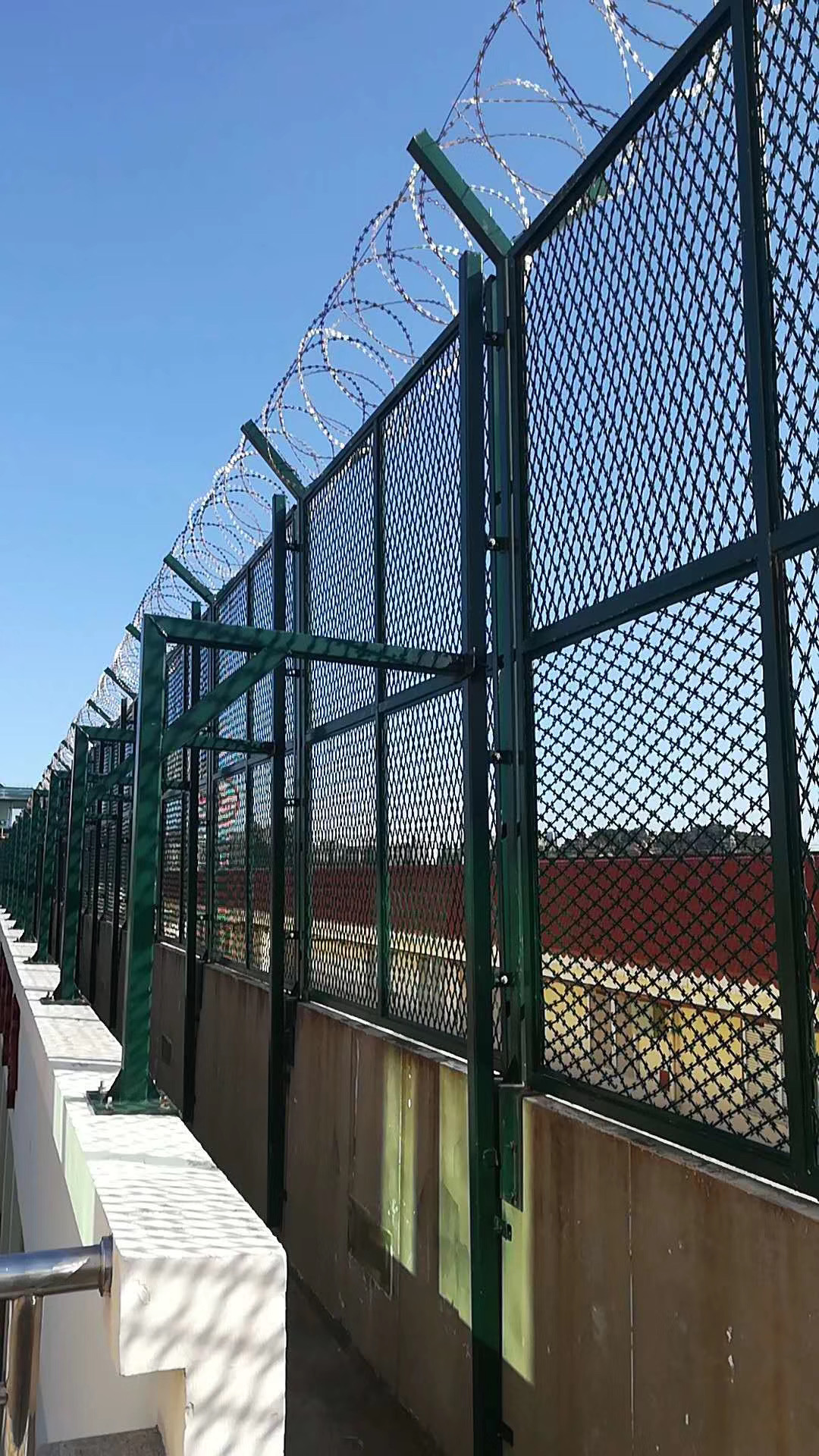 內(nèi)外墻巡邏道專(zhuān)用隔離網(wǎng)主要是采用高強(qiáng)度的刀片刺網(wǎng)與普通防護(hù)網(wǎng)的結(jié)合,由V型支架立拄,加強(qiáng)型焊接片網(wǎng),安全防盜連接件和刀片刺網(wǎng)組成。這樣的組合具有很好的嚇阻和防止攀爬的功能,慕源隔離網(wǎng)廠(chǎng)選用優(yōu)質(zhì)原材料更是保障了隔離網(wǎng)的質(zhì)量。刀片刺網(wǎng)是一種新型防護(hù)網(wǎng),由銳利尖角鍍鋅鋼板或不銹鋼薄板做刀片,鋼絲做芯線(xiàn)組合而成的防護(hù)器材。其突出的防攀爬效果使其成為三所一隊(duì)內(nèi)外監(jiān)墻巡邏道專(zhuān)用隔離網(wǎng)必備的組成部分??词厮⒕辛羲?、戒毒所、武警中隊(duì),三所一隊(duì)內(nèi)外監(jiān)墻巡邏道專(zhuān)用隔離網(wǎng)常見(jiàn)規(guī)格:刀片刺網(wǎng):50cm-80cm直徑刀片刺網(wǎng),型號(hào)BTO-22,材質(zhì)為熱鍍鋅或304不銹鋼材質(zhì);網(wǎng)片:網(wǎng)片一般采用鋼筋焊接網(wǎng),也可采用鋼板沖壓網(wǎng)、直線(xiàn)刀片刺網(wǎng)、太陽(yáng)花刀刺網(wǎng)等特殊型網(wǎng)片;